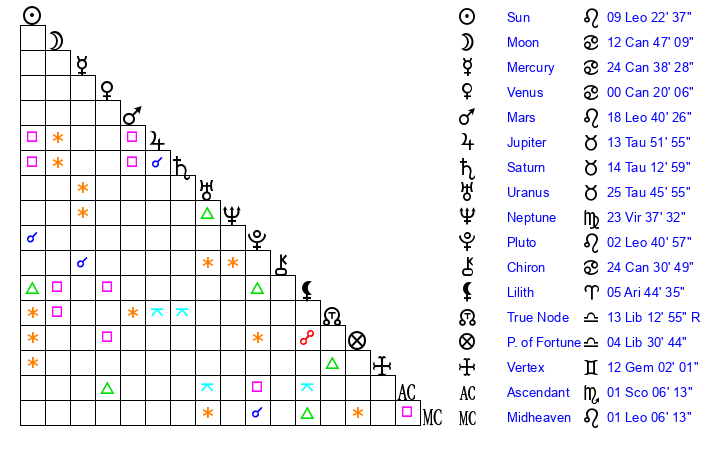 | Mercury | 24 Cancer 39 | 8 Leo 47 | 25 Scorpio 25 |