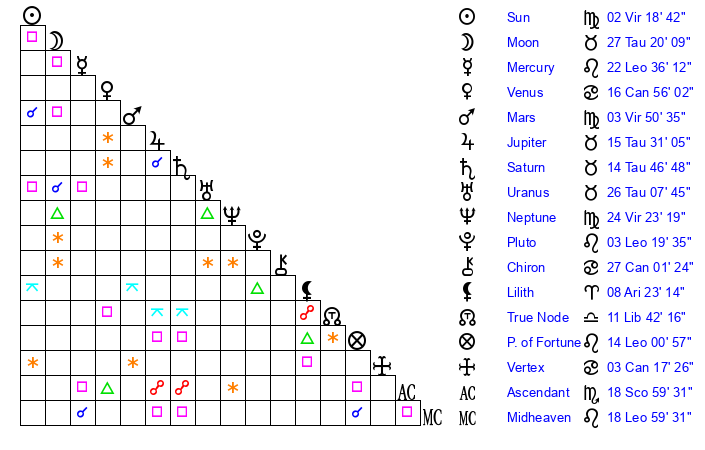 | Neptune | 24 Virgo 23 | 1 Aries 30 | 27 Virgo 13 |