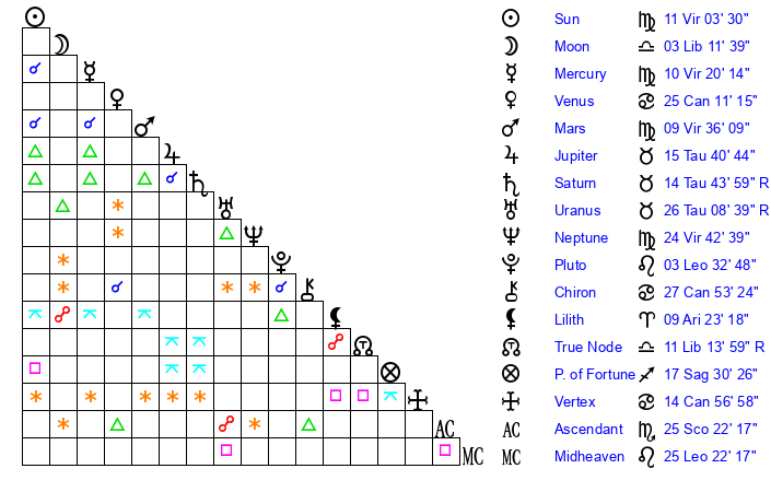 | Mercury | 9 Virgo 25 | 1 Virgo 22 | 14 Scorpio 57 |