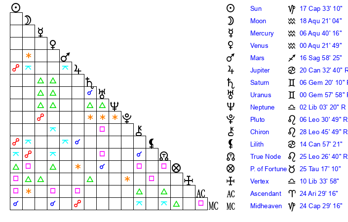 | Moon | 11 Aquarius 3 | 20 Virgo 4 | 22 Aquarius 24 |