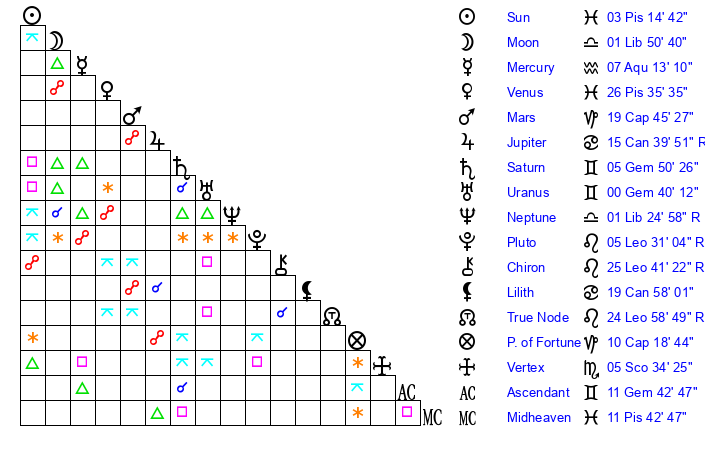 | Saturn | 6 Gemini 6 | 19 Pisces 48 | 13 Gemini 16 |