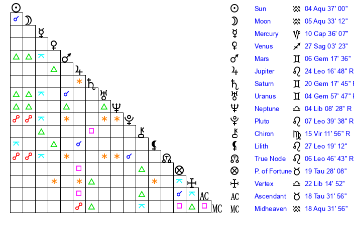 | Saturn | 20 Gemini 40 | 16 Pisces 38 | 22 Gemini 37 |