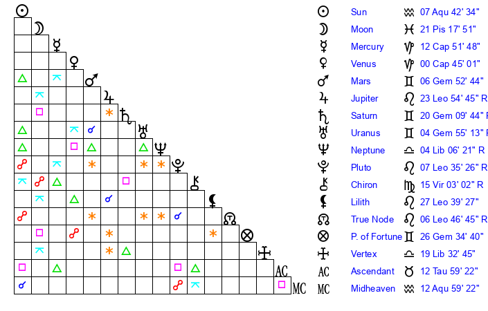| Moon | 13 Pisces 26 | 21 Capricorn 57 | 24 Aquarius 43 |