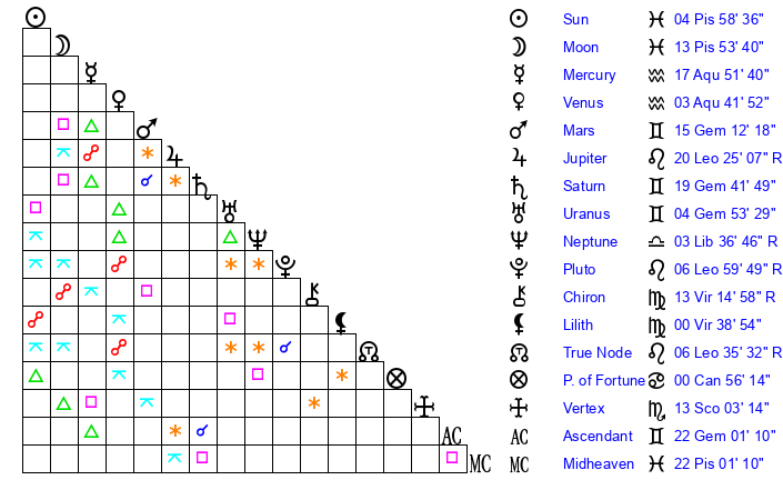 | Moon | 6 Pisces 39 | 16 Capricorn 19 | 21 Aquarius 8 |
