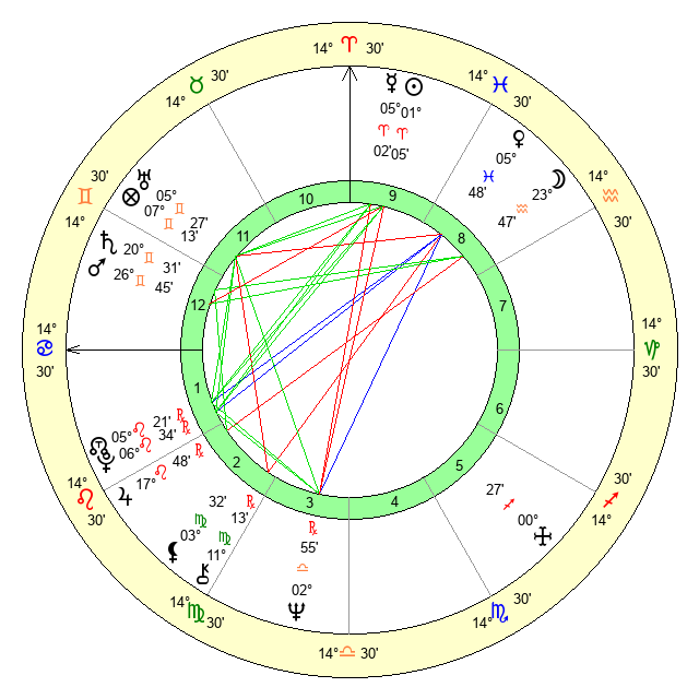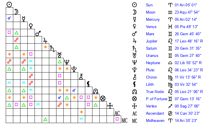 | Moon | 15 Aquarius 3 | 16 Sagittarius 29 | 3 Aquarius 43 |