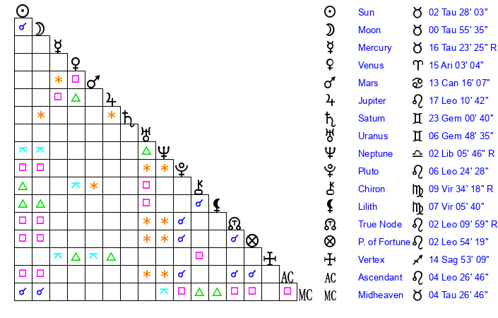 | Mercury | 16 Taurus 25 | 5 Aries 4 | 1 Leo 47 |