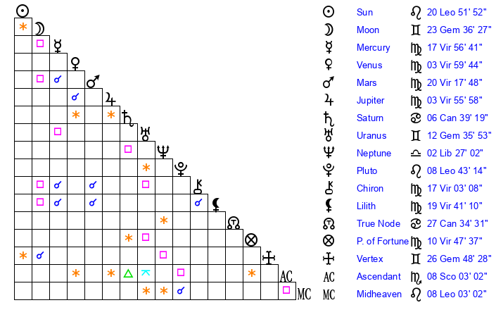 | Mercury | 17 Virgo 30 | 4 Leo 27 | 17 Scorpio 19 |