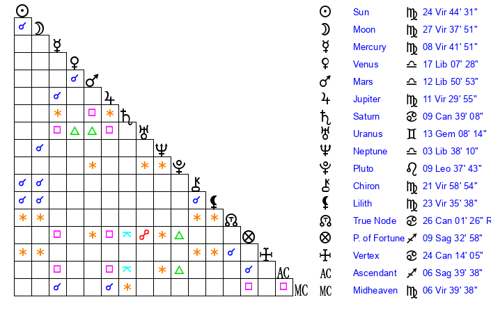 | Moon | 20 Virgo 59 | 29 Cancer 59 | 10 Virgo 43 |
