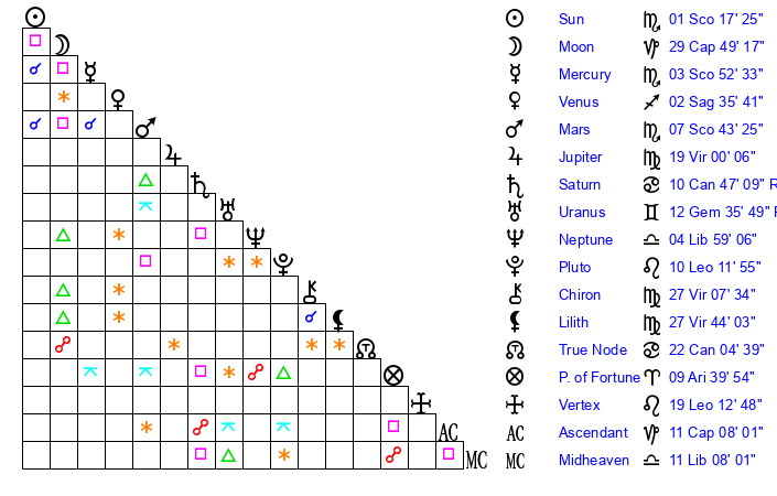 | Sun | 0 Scorpio 41 | 1 Scorpio 3 | 22 Capricorn 41 |