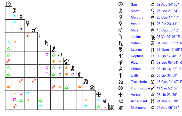| Moon | 19 Leo 48 | 5 Aquarius 41 | 27 Cancer 45 |