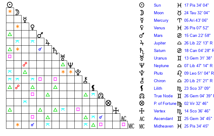 | Sun | 17 Pisces 5 | 17 Pisces 56 | 4 Gemini 25 |