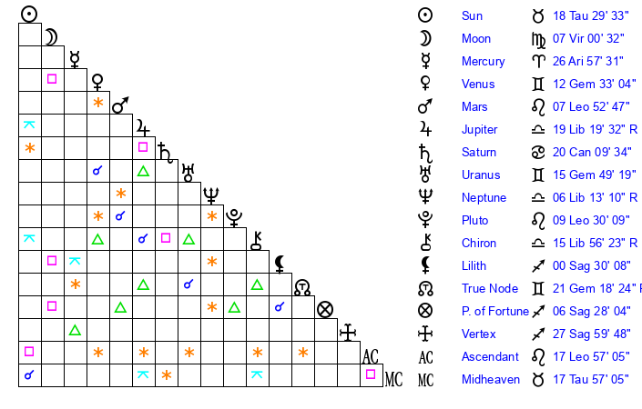 | Sun | 18 Taurus 2 | 18 Taurus 54 | 3 Leo 37 |