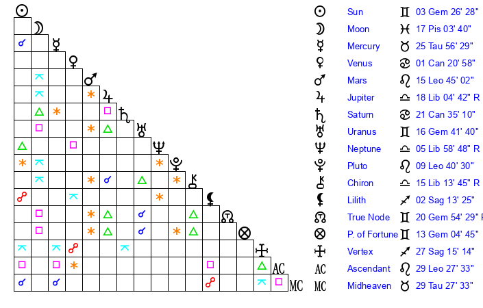 | Sun | 3 Gemini 27 | 4 Gemini 19 | 18 Leo 57 |