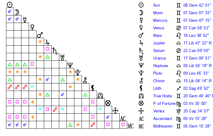 | Sun | 8 Gemini 15 | 9 Gemini 7 | 23 Leo 45 |