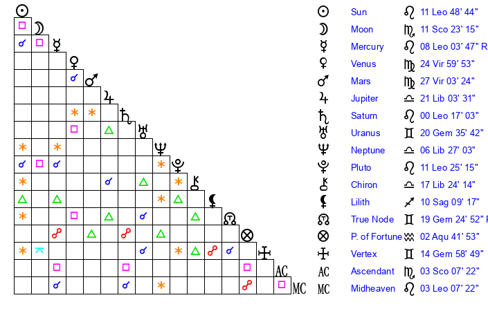 | Sun | 11 Leo 17 | 12 Leo 9 | 28 Libra 15 |