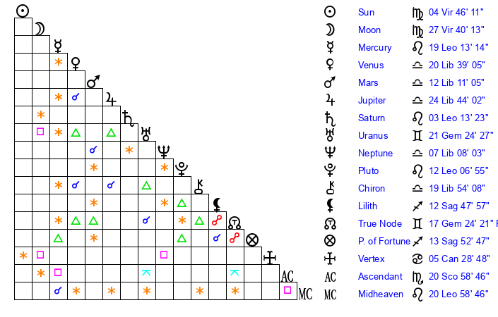 | Moon | 21 Virgo 52 | 2 Scorpio 34 | 13 Leo 39 |