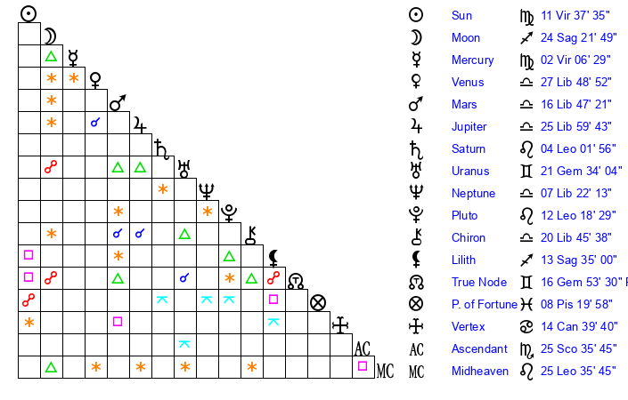 | Sun | 11 Virgo 7 | 11 Virgo 59 | 29 Scorpio 21 |
