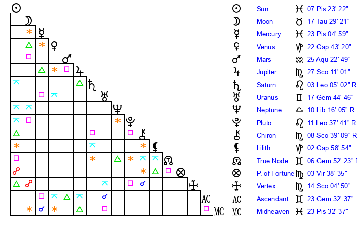 | Sun | 6 Pisces 49 | 7 Pisces 54 | 23 Taurus 36 |