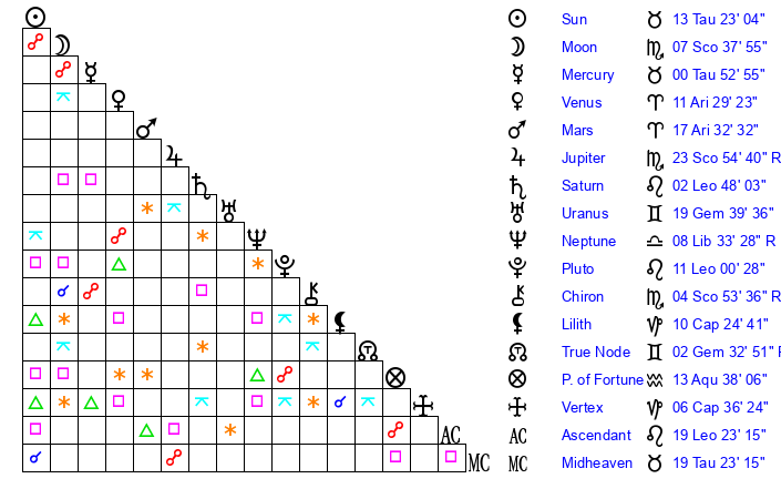 | Mars | 17 Aries 13 | 7 Leo 7 | 14 Gemini 5 |