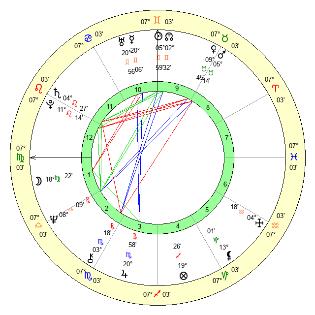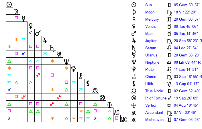 | Moon | 19 Virgo 53 | 23 Gemini 15 | 19 Cancer 36 |