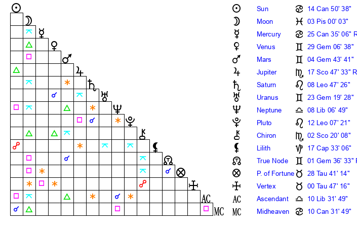 Sun | 14 Cancer 19 | 15 Cancer 25 | 29 Virgo 23 |