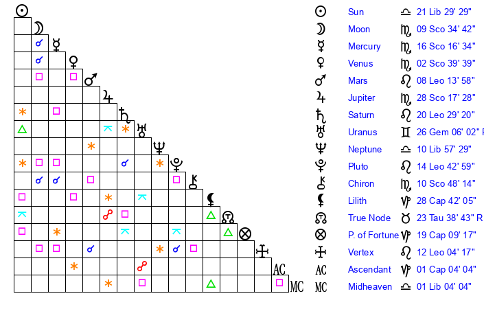 | Moon | 3 Scorpio 42 | 10 Leo 49 | 11 Virgo 8 |