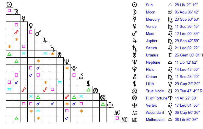 | Neptune | 11 Libra 12 | 29 Pisces 59 | 12 Libra 58 |