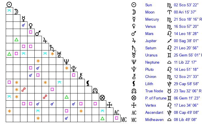 | Neptune | 11 Libra 23 | 29 Pisces 52 | 12 Libra 59 |