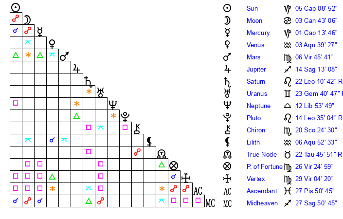| Neptune | 12 Libra 53 | 29 Pisces 26 | 12 Libra 6 |