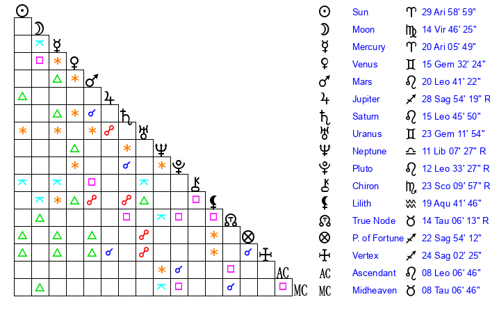 | Mercury | 20 Aries 18 | 3 Aries 12 | 28 Gemini 19 |
