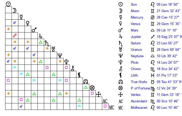 | Moon | 15 Gemini 22 | 6 Scorpio 31 | 14 Aries 37 |