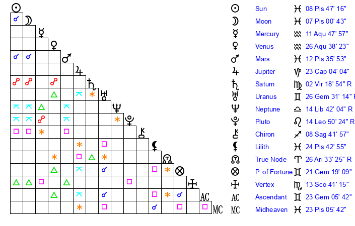 | Sun | 8 Pisces 21 | 8 Pisces 55 | 23 Taurus 8 |