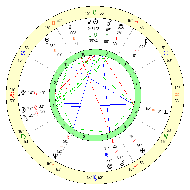 | Moon | 20 Leo 17 | 5 Virgo 38 | 1 Gemini 43 |