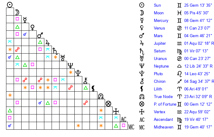 | Sun | 24 Gemini 46 | 25 Gemini 23 | 7 Virgo 31 |