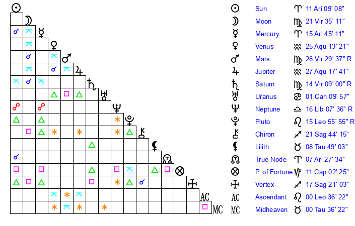 | Moon | 18 Virgo 53 | 21 Taurus 24 | 19 Gemini 16 |