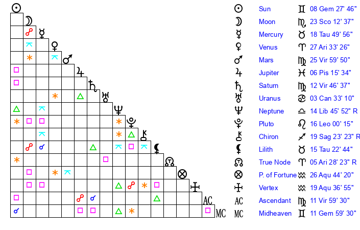 | Sun | 8 Gemini 17 | 9 Gemini 7 | 19 Leo 56 |