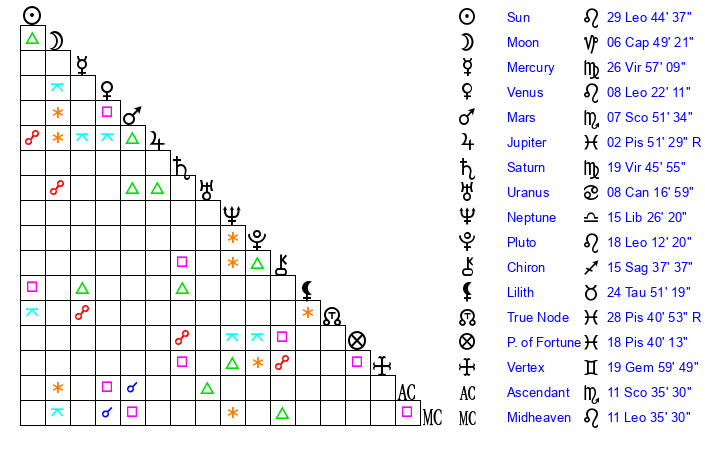 | Venus | 8 Leo 8 | 27 Cancer 7 | 11 Scorpio 21 |