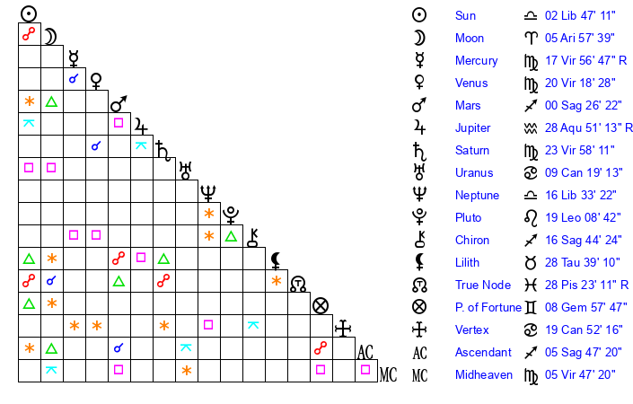 | Venus | 20 Virgo 5 | 8 Virgo 15 | 24 Sagittarius 4 |