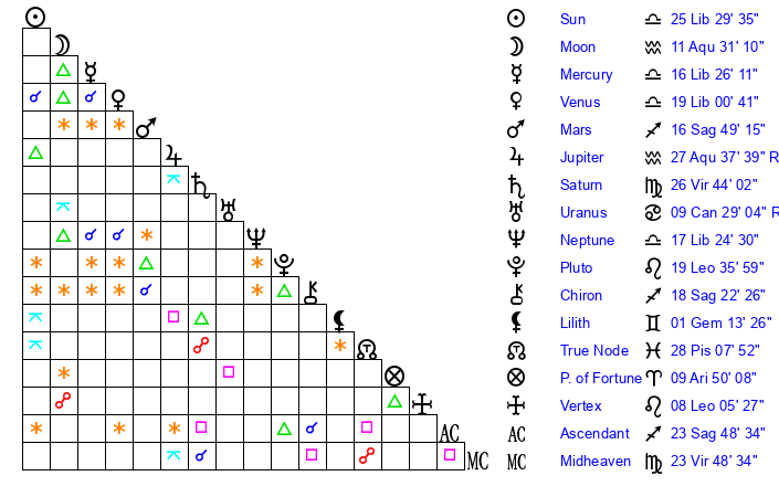 | Saturn | 27 Virgo 11 | 26 Pisces 22 | 2 Libra 47 |
