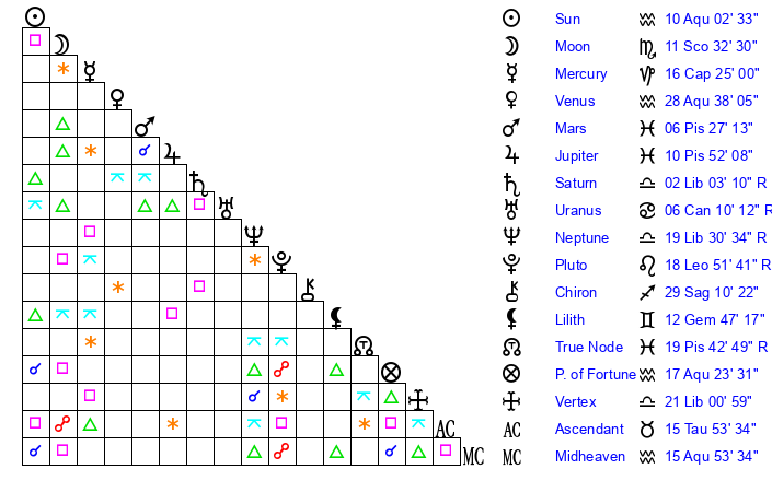 | Saturn | 2 Libra 36 | 17 Pisces 10 | 27 Virgo 43 |