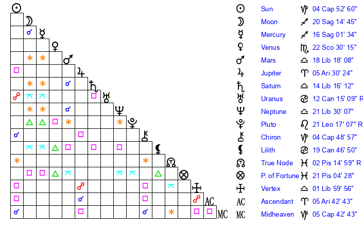| Mars | 18 Libra 12 | 9 Capricorn 4 | 17 Scorpio 7 |