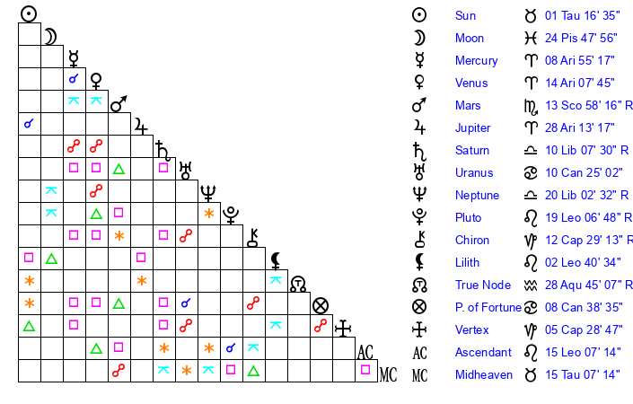 | Pluto | 19 Leo 6 | 3 Aquarius 46 | 19 Leo 58 |