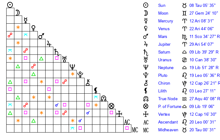 | Moon | 25 Gemini 6 | 14 Taurus 49 | 26 Aquarius 31 |
