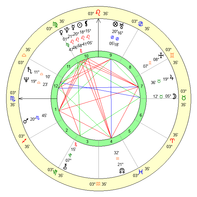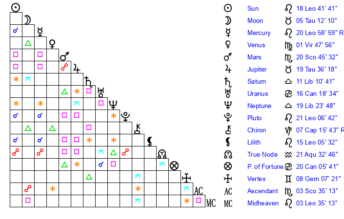 | Mercury | 21 Leo 8 | 4 Leo 14 | 17 Scorpio 39 |