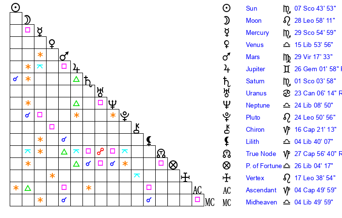 | Sun | 7 Scorpio 32 | 8 Scorpio 5 | 20 Capricorn 30 |