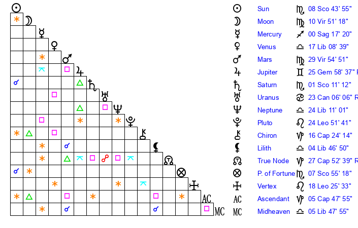 | Mars | 29 Virgo 48 | 27 Scorpio 40 | 13 Scorpio 36 |