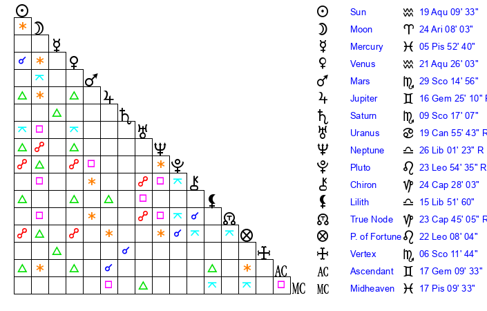 | Mercury | 5 Pisces 36 | 18 Aquarius 49 | 11 Aries 2 |