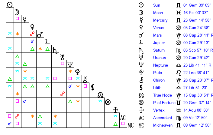 | Sun | 4 Gemini 28 | 5 Gemini 16 | 12 Leo 18 |