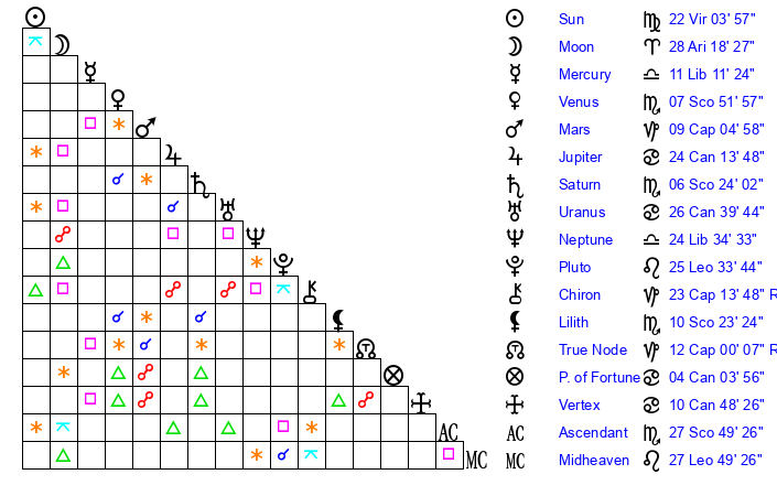 | Sun | 21 Virgo 53 | 22 Virgo 41 | 2 Sagittarius 27 |
