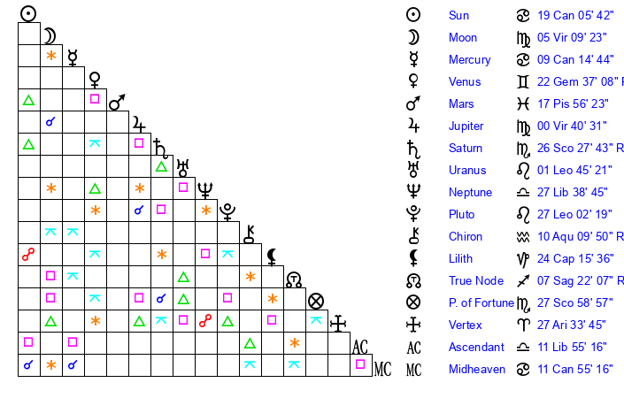 | Sun | 18 Cancer 55 | 19 Cancer 13 | 25 Virgo 18 |